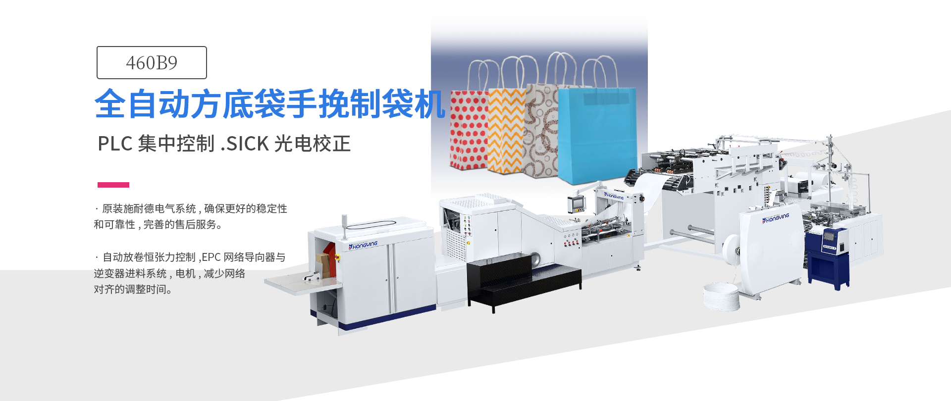 450B9全自動方底手挽手提袋紙袋機,它具有速度快、生產效益高、調節范圍大的優點,綜合國內同類產品不足之處而改進的新型設備,此設備是將原色或印刷好的卷筒紙由本機一次完成側邊上膠、折疊成微、紙筒切斷、底部涂膠、袋底成型、出袋,整機由計算機控制系統控制、觸摸屏顯示,伺服電機控制制紙袋長短,可生產多種規格紙袋,每分鐘快可達220袋,大大減速少了人工成本,是紙袋生產加工的設備。450B9全自動